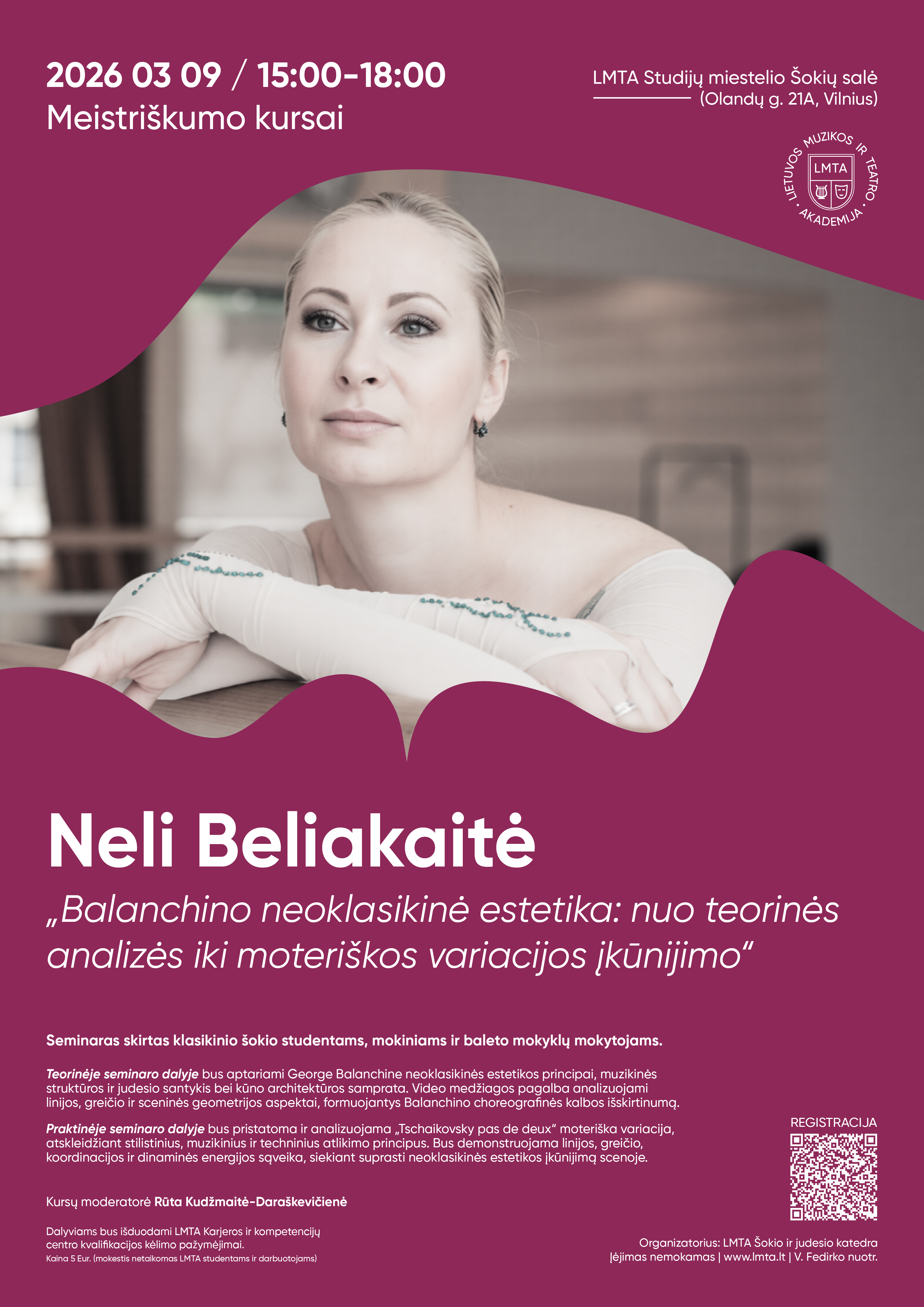 Neli Beliakaitė – baleto artistė, pedagogė ir baleto meno puoselėtoja, įkūrusi Neli Beliakaitės Baleto akademiją Lietuvoje. Profesinę sceninę patirtį ji kaupė dirbdama tarptautinėse trupėse, o reikšmingas karjeros etapas buvo darbas Sacramento Ballet Jungtinėse Amerikos Valstijose. Šioje trupėje ji šoko klasikinio repertuaro ir neoklasikiniuose Balachino spektakliuose, tobulino techniką bei sceninę raišką, dirbo su skirtingų mokyklų choreografais. Patirtis Sakramente sustiprino jos meninę brandą ir pedagoginį požiūrį, kurį vėliau pritaikė ugdydama jaunuosius šokėjus Lietuvoje. Sugrįžusi ji aktyviai vysto baleto edukaciją, derindama tarptautinę patirtį su lietuviškos baleto mokyklos tradicija. Seminaras skirtas klasikinio šokio studentams, mokiniams ir baleto mokyklų mokytojams, siekiant gilinti George Balanchine neoklasikinės choreografinės kalbos suvokimą ir jos taikymą pedagoginėje bei sceninėje praktikoje. Programoje integruojama teorinė Balanchino estetikos analizė ir praktinė moteriškos variacijos demonstracija, akcentuojant muzikalumo, linijos architektūros ir stilistinio tikslumo principus. Balanchino stilistika yra reikšminga šiuolaikinio klasikinio baleto repertuaro dalis, todėl jos sisteminis pažinimas būtinas tiek profesionaliam atlikimui, tiek metodiniam mokymo procesui, siekiant užtikrinti stilistinį nuoseklumą ir aukštą pedagoginę kokybę.Teorinėje seminaro dalyje bus aptariami George Balanchine neoklasikinės estetikos principai, muzikinės struktūros ir judesio santykis bei kūno architektūros samprata. Video medžiagos pagalba analizuojami linijos, greičio ir sceninės geometrijos aspektai, formuojantys Balanchino choreografinės kalbos išskirtinumą. Praktinėje seminaro dalyje bus pristatoma ir analizuojama „Tschaikovsky pas de deux“ moteriška variacija, atskleidžiant stilistinius, muzikinius ir techninius atlikimo principus. Bus demonstruojama linijos, greičio, koordinacijos ir dinaminės energijos sąveika, siekiant suprasti neoklasikinės estetikos įkūnijimą scenoje.
