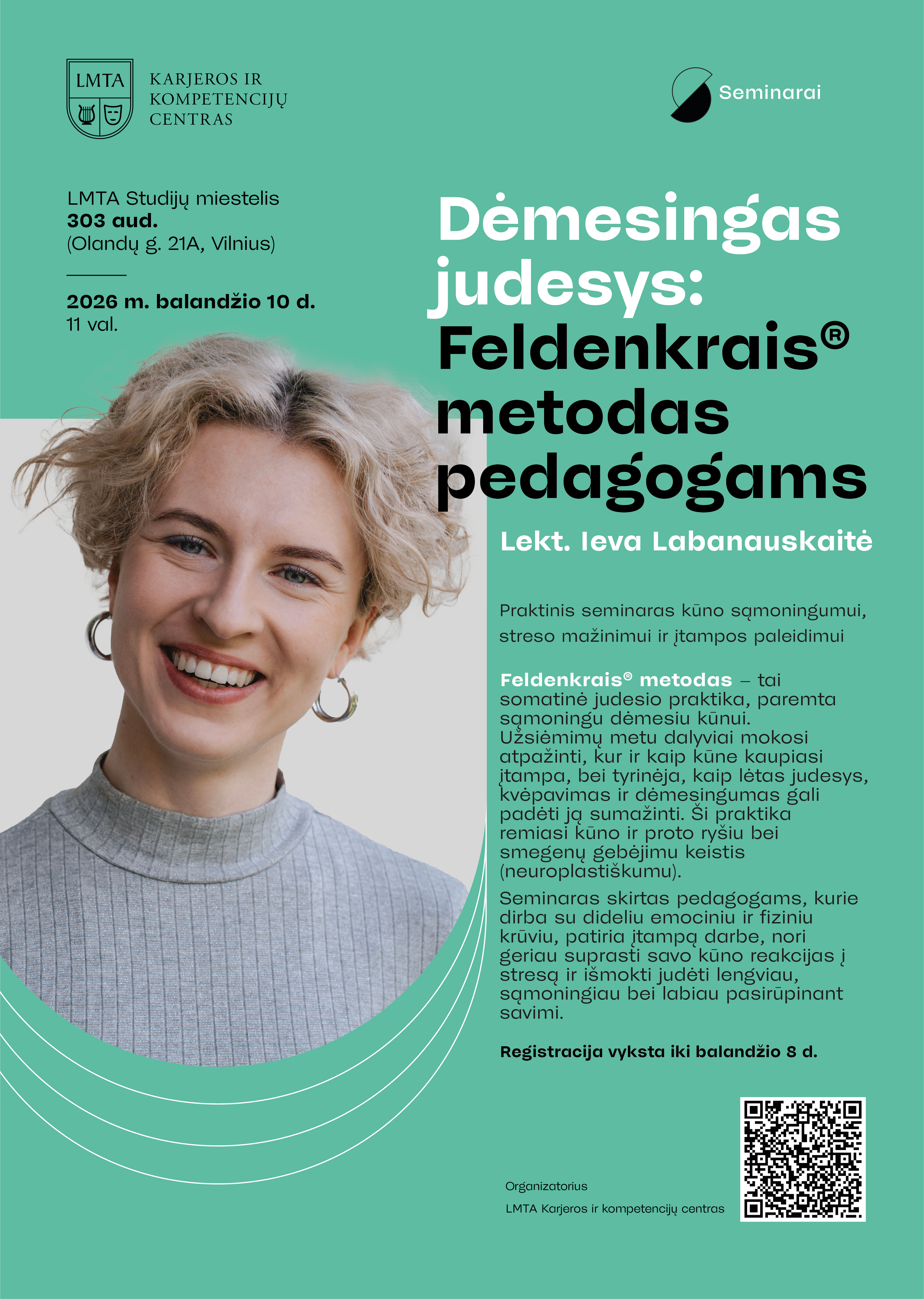 Seminaras skirtas pedagogams, kurie dirba su dideliu emociniu ir fiziniu krūviu, patiria įtampą darbe, nori geriau suprasti savo kūno reakcijas į stresą ir išmokti judėti lengviau, sąmoningiau bei labiau pasirūpinant savimi.