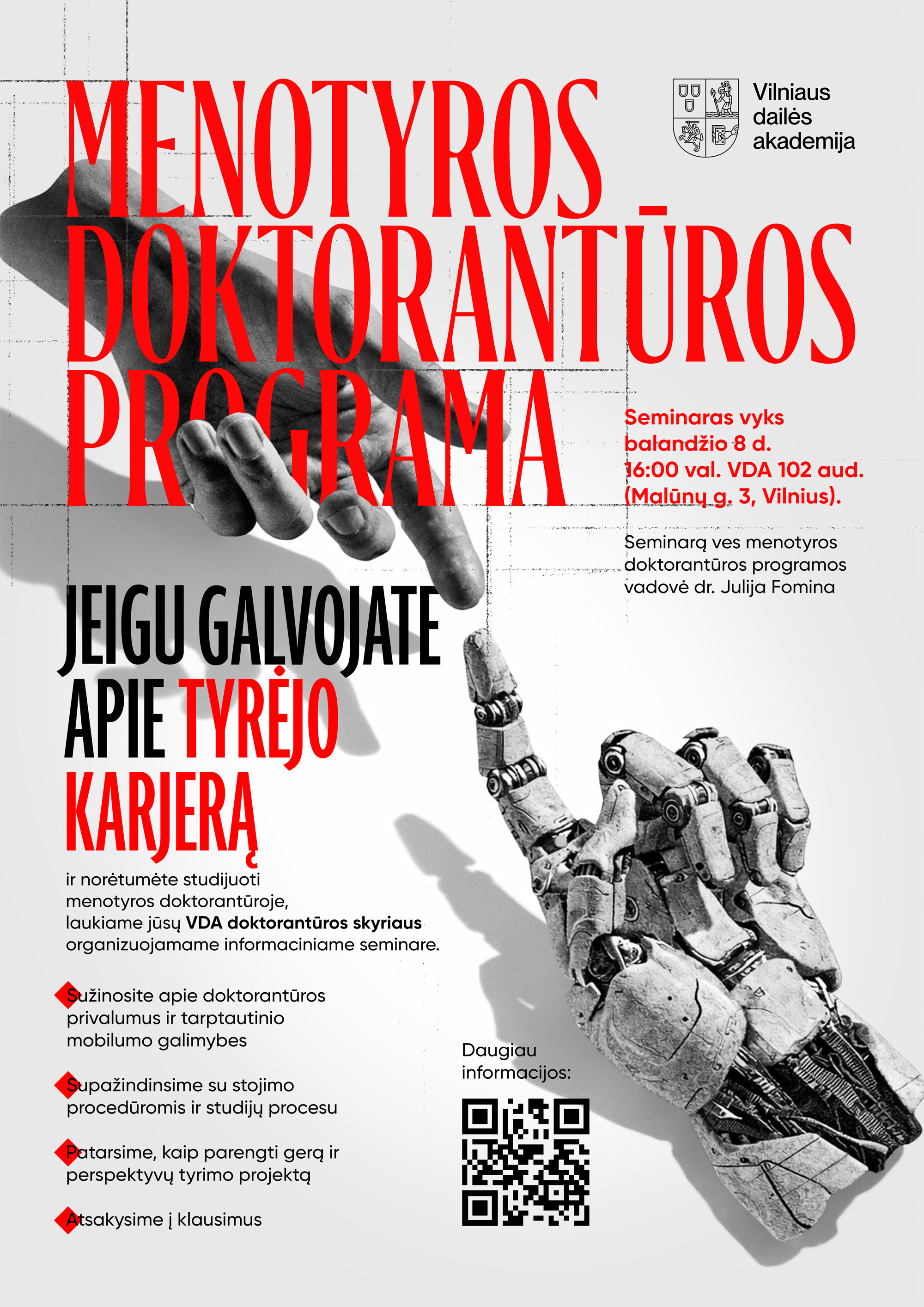 Jeigu galvojate apie tyrėjo karjerą ir norėtumėte studijuoti menotyros doktorantūroje, laukiame jūsų VDA Doktorantūros skyriaus organizuojamame informaciniame seminare.